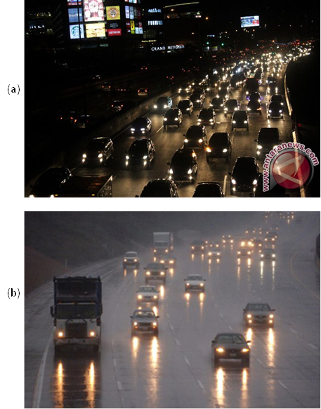 - Marka jalan menjadi kurang jelas (kabur) meskipun telah disoroti lampu kendaraan (contohnya lihat Gambar 1(a))