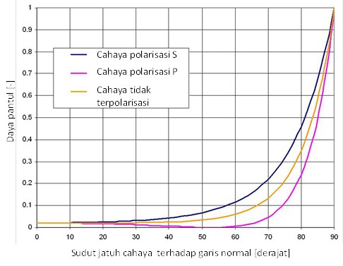 Ternyata kekuatan pantulan cahaya oleh permukaan air bergantung pada sudut datang cahaya ke permukaan air. Sudut datang cahaya adalah sudut antara garis normal dan arah dapat cahaya. Sudut teta pada Gambar 3 adalah sudut datang cahaya. Hasil esperimen menunjukkan bahwa makin besar sudut datang cahaya maka makin banyak porsi cahaya yang dipantulkan. Porsi cahaya yang dipantulkan pada berbagai sudut datang cahaya ditunjukkan pada Gambar 4. Pada gambar ditampilkan tiga kurva, yaitu cahata polarisasi S, cahaya polarisasi P dan cahaya tidak terpolarisasi. Sinar lapu mobil umumnya masuk katagori cahaya tidak terpolarisasi. Kita simpulkan dari gambar tersebut bahwa ketika susut datang lebih dari 70o maka lebih dari 20% cahaya yang jatuh di permukaan air dipantulkan.