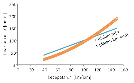 Gambar 2 memperlihatkan hasil perhitungan dengan persamaan (8) yang ditunjukkan dengan simbol lingkarann. Tampak bahwa jarak aman bergentuk pada kecepatan kendaraan. Jarak aman bertambah dengan bertambahkan kecepatan kendaraan secara kuadratik. Namun kecepatan kebndaraan di jalan tol berkisar antara 60 km/jam hingga 100 km/jam. Garis lurus pada hambar adalah kiurva yang menyatakan nilai kecepatan dalam km/jam sama dengan jarak aman dama m. Dengan memndabingkan dua kurva tampak bahwa antara kecepatan 60 km/jam hingga sekitar 100 km/jam dua kurva hampir berimpit. Dari sini dapat disimpulkan bahwa jarak aman kendaranaan dengan kendaraan di depannya dalam satuan meter kira-kira sama dengan nilai kecepatan dalam satuan km. Misalnya kita sedang melaju dengan kecepatan 70 km/jam maka jarak aman dngan kendaraan di depannya paling dekat 70 meter. Jika kita sedang melaju dengan kecepatan 100 km/jam maka jarak aman dengan kendaraan di depan paling dekat 100.