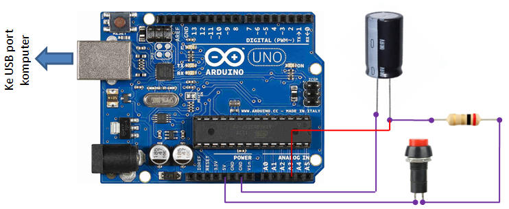Saya melakukan percobaan menggunakan Arduino untu mengukur tegangan pengisian dan pengosongan kapasitor pada berbagai waktu. Rangkaian yang digunakan tampak pada Gambar 221.1.