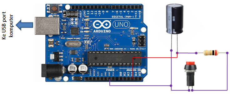 Program yang diisi ke Arduino sangat sederhana (lihat di bagian akhir). Prinsip pengukuran juga sederhana. Arduino membaca tegangan pada kaki kapasitor saat akan mulai menekan tombol. Tegangan pada kaki kapasitor dibaca terus hingga mendekati tegangan yang diberikan. Bacaan Arduino ditampilkan di layar komputer berupa waktu dan tegangan. Setelah membaca beberapa menit, maka data tersebut di-copy ke excel. Kurva tegangan terhadap waktu digambar di excel.
