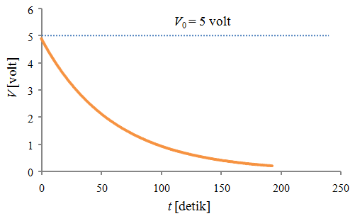 \( \log (V_0 – V) = \log V_0 +{t \over T} \log (1/2) \)\( = \log V_0 -{\log 2 \over T} t \)Kita juga sudah memiliki kurva pengosongan kapasitor,