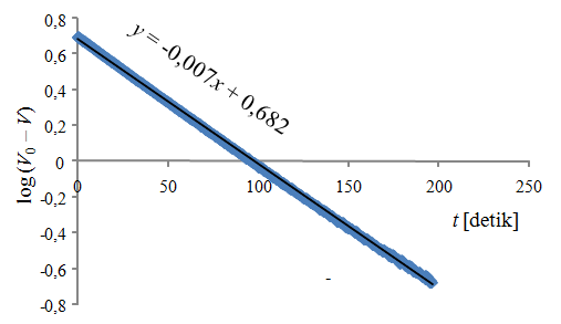\( V_0 – V = V_0 {\left ({1 \over 2} \right )}^{t/T} \)Jika kita ambil logaritma ruas kiri dan kanan maka kita peroleh