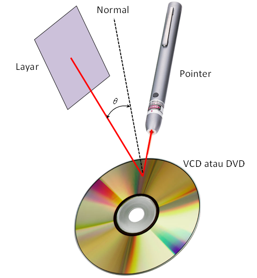 Bersykurlan, kita diuntungkan oleh adanya CD, VCD, atau DVD. Ketika CD, VCD, atau DVD ditulis data maka yang dilakukan adalah membuat goresan-goresan pada permukaanya. Goresan tersebut menyimpan blangan biner 0 atau 1. Dan yang luar biasa adalah jarak antar goresan kira-kira sama dengan panjang gelombang cahaya. Gambar 4 adalah contoh foro permukaan CD menggunakan miroskop electron. Panjang bar putih adalah 5 mm. Kalau kita lihat secara seksama, jarak antara dua goresan sekitar 0,5 mm. Angka ini kira-kira sama dengan panjang gelombang cahaya. Berati kita dapat menggunakan permukaan CD atau VCD untuk mendemosntrasikan peristiwa difraksi cahaya.